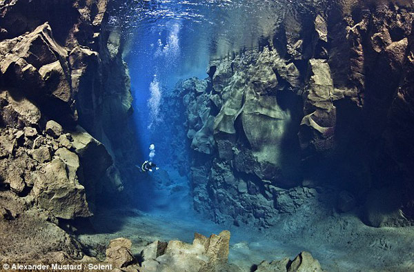 But Alexander Mustard does not fear the hazards: “‘The photos show diving in the unique underwater world of Iceland which, like on land, is formed by the volcanic landscape of the country. For a scuba diver these are spectacular places to visit – being able to fly through the clear water and explore the fault lines in three dimensions.I have dived all around the world and this is almost certainly the clearest water I have ever been in“. [more info on Mail Online]